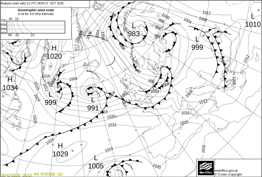 Ψυχρό Μέτωπο Όταν ο αέρας ανεβαίνει, η πίεση πίσω του μικραίνει, διότι η προς τα πάνω κινούμενη μάζα αέρα δεν πιέζει φυσικά προς τα κάτω, προς την επιφάνεια του εδάφους τόσο σκληρά. Περιοχές με υψηλή πίεση σχηματίζονται όταν ο αέρας βυθίζεται πιέζοντας έτσι σκληρά προς τα κάτω. Ο αέρας κινείται από περιοχές υψηλής πίεσης προς περιοχές χαμηλής και αυτό ακριβώς συνιστά τον άνεμο, ο οποίος είναι τόσο ισχυρότερος όσο η διαφορά των πιέσεων είναι ευρύτερη. Η πίεση του αέρα μετρείται συνήθως σε μιλιμπάρς (mb) με κατάλληλα όργανα, τα βαρόμετρα. Τα βαρομετρικά συστήματα πού παρατηρούνται στην τροπόσφαιρα διακρίνονται σε Βαρομετρικά Χαμηλά ή Κυκλώνες και σε Βαρομετρικά Υψηλά ή Αντικυκλώνες. |